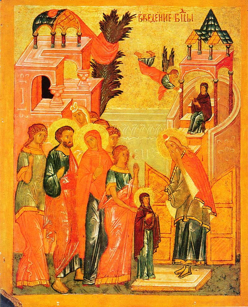 Родители Пречистой Девы, Иоаким и Анна, очень долго не имели детей, но усердно молились, испрашивая у Бога рождения ребенка. Они дали обет посвятить его Господу. Иоаким и Анна стали родителями уже в очень преклонном возрасте, а родившееся чадо — Богоотроковицу Марию, когда ей исполнилось 3 года, торжественно повели в Иерусалимский храм.