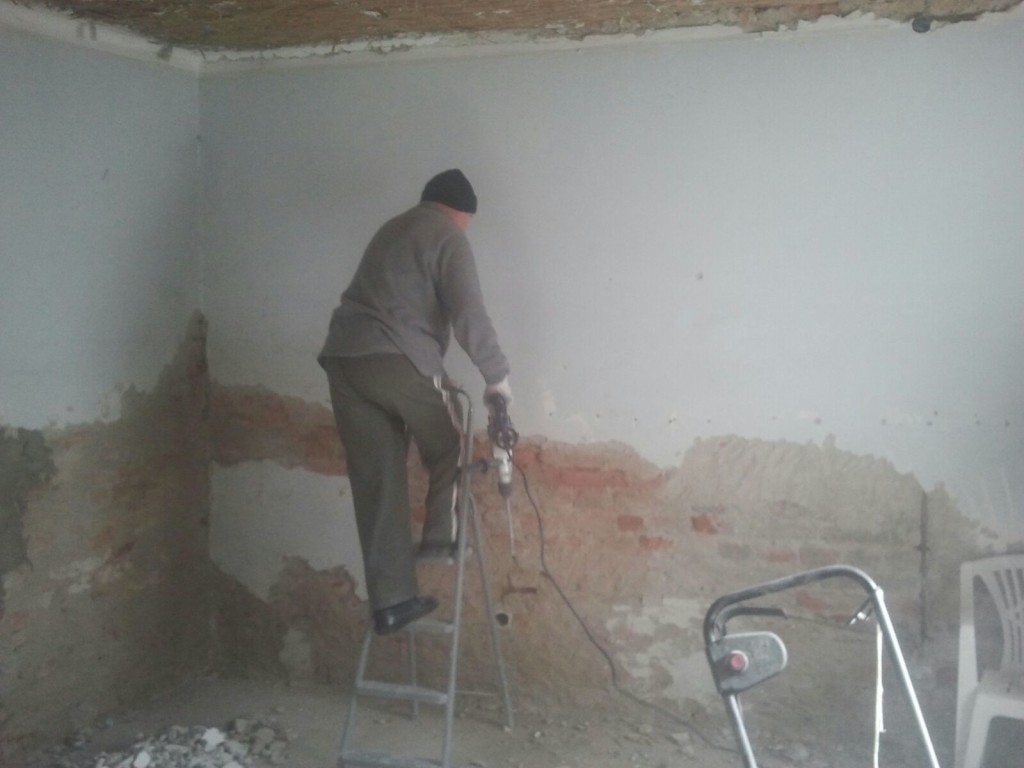 Потолка не было, штукатурка со стен обвалилась, полы, входные двери и рамы сгнили, многие стекла были выбиты.