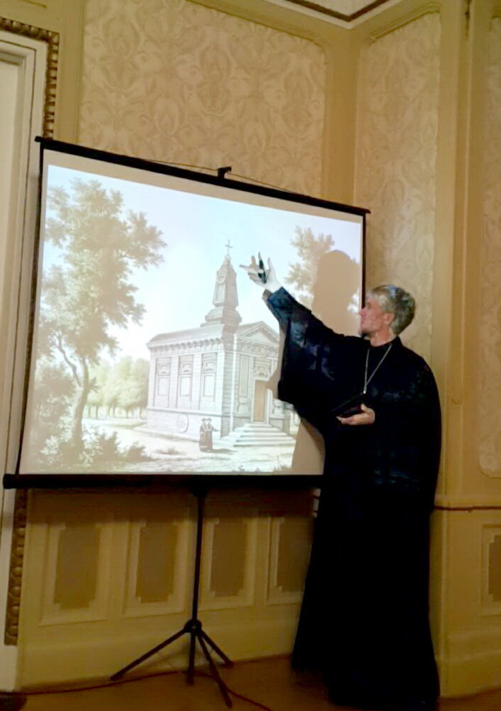 Священник Дмитрий представил вниманию присутствующих историю храма-усыпальницы в Иреме, где в крипте покоятся земные останки Александры (о чём к сожалению не знала часть слушателей ), рассказал об архитектуре храма и его внутреннем убранстве, главным украшением которого является иконостас работы академика живописи Васильева В.В. подаренный храму Александром III к столетию со дня рождения Великой княгини в 1883 г.