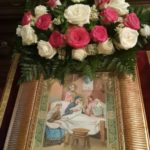 Молившиеся в храме могли приложиться к иконе Рождества Богородицы украшенной живыми цветами.
